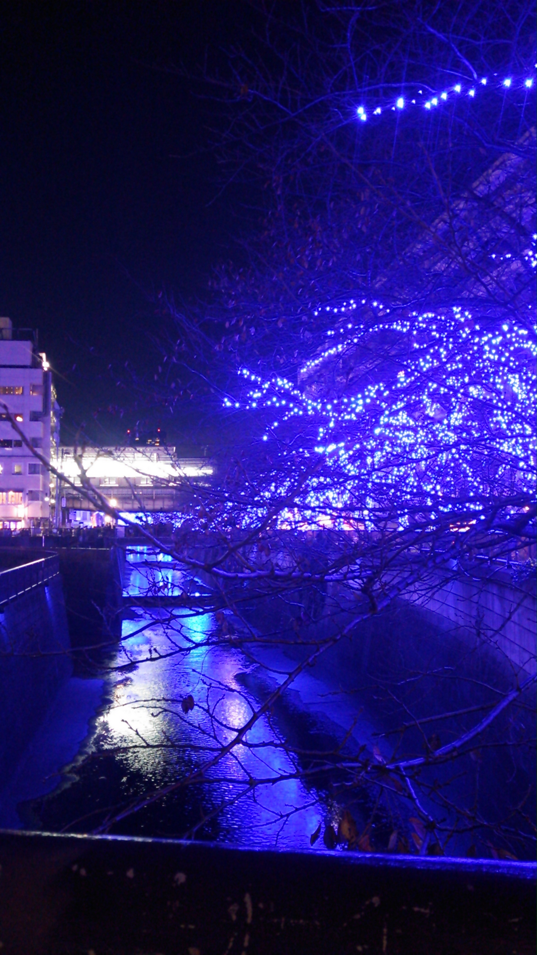 夕飯もイルミ眺めながら。水面に映る光も綺麗!